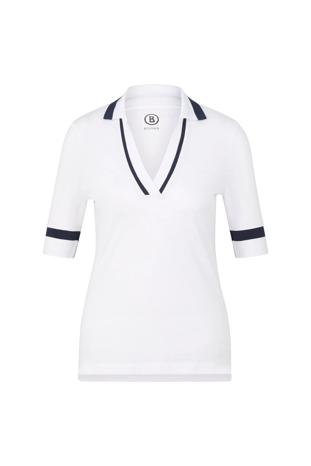Gemaakt van sneldrogend en ademend piqué-jersey in een katoen-nylonmix, is het Elonie-poloshirt een overtuigende functionele stylingpartner. De turn-down kraag met aangezette V-hals en contrasterende streepdetails benadrukken de look, aangevuld met fijne logostiksels. Brede geribbelde manchetten en de zoom met zijsplit zorgen voor een harmonieuze afwerking.
