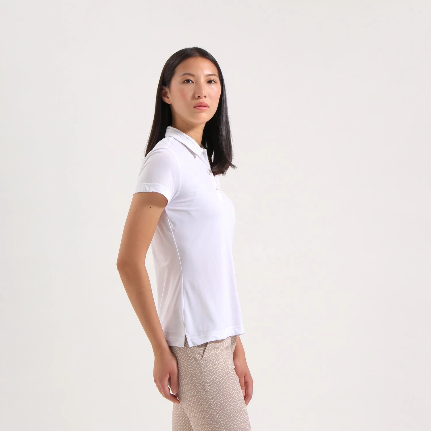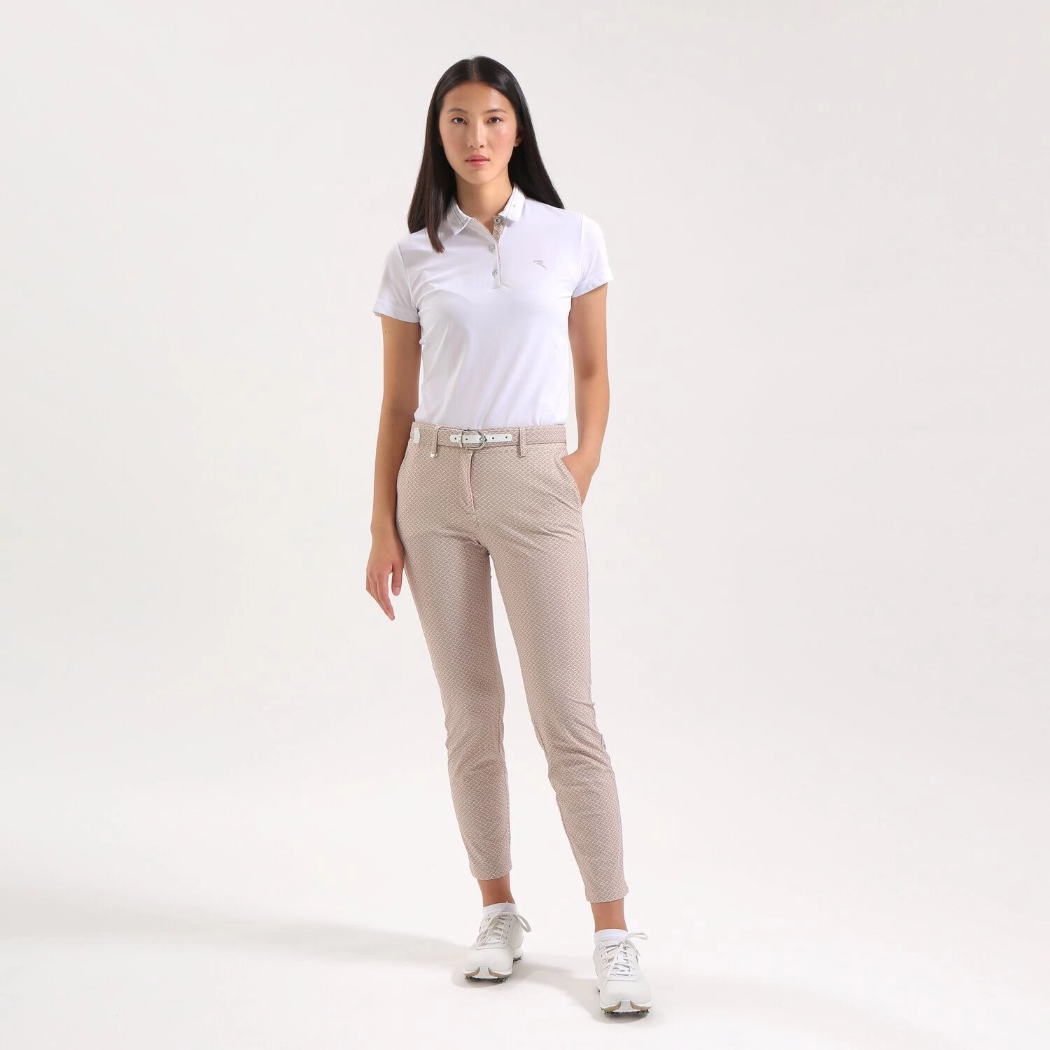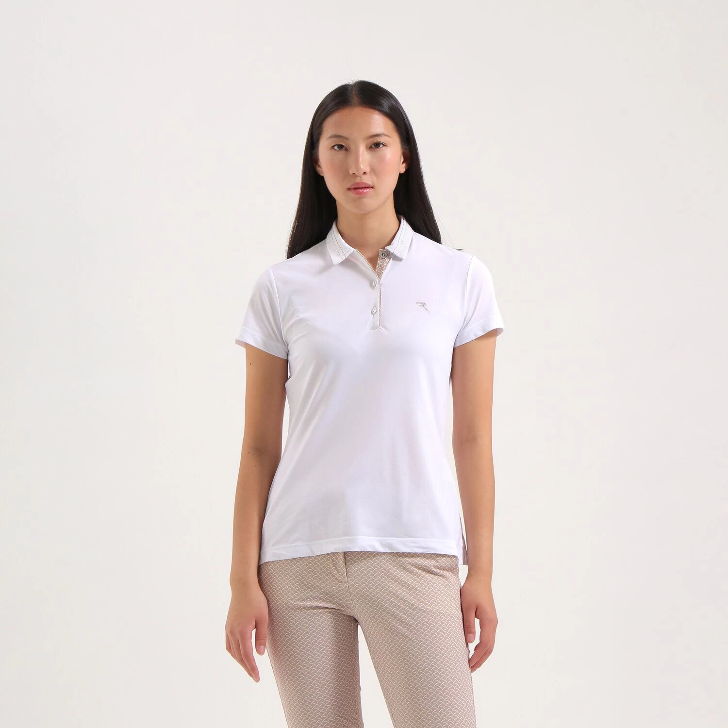 Het AAA damespoloshirt is gemaakt van stretchpiqué en biedt met de ultralichte Dry-Matic technologie uitzonderlijk ademend vermogen en blijvende frisheid, ideaal voor tropische dagen. Het ontwerp is voorzien van een dubbele kraag en volledig bedrukte stoffen inzetstukken, met verfijnde en vrouwelijke details zoals de zilveren knopen en bijpassend bolvormig borduursel op de kraag. Het shirt is ook voorzien van een logoprint op de borst.